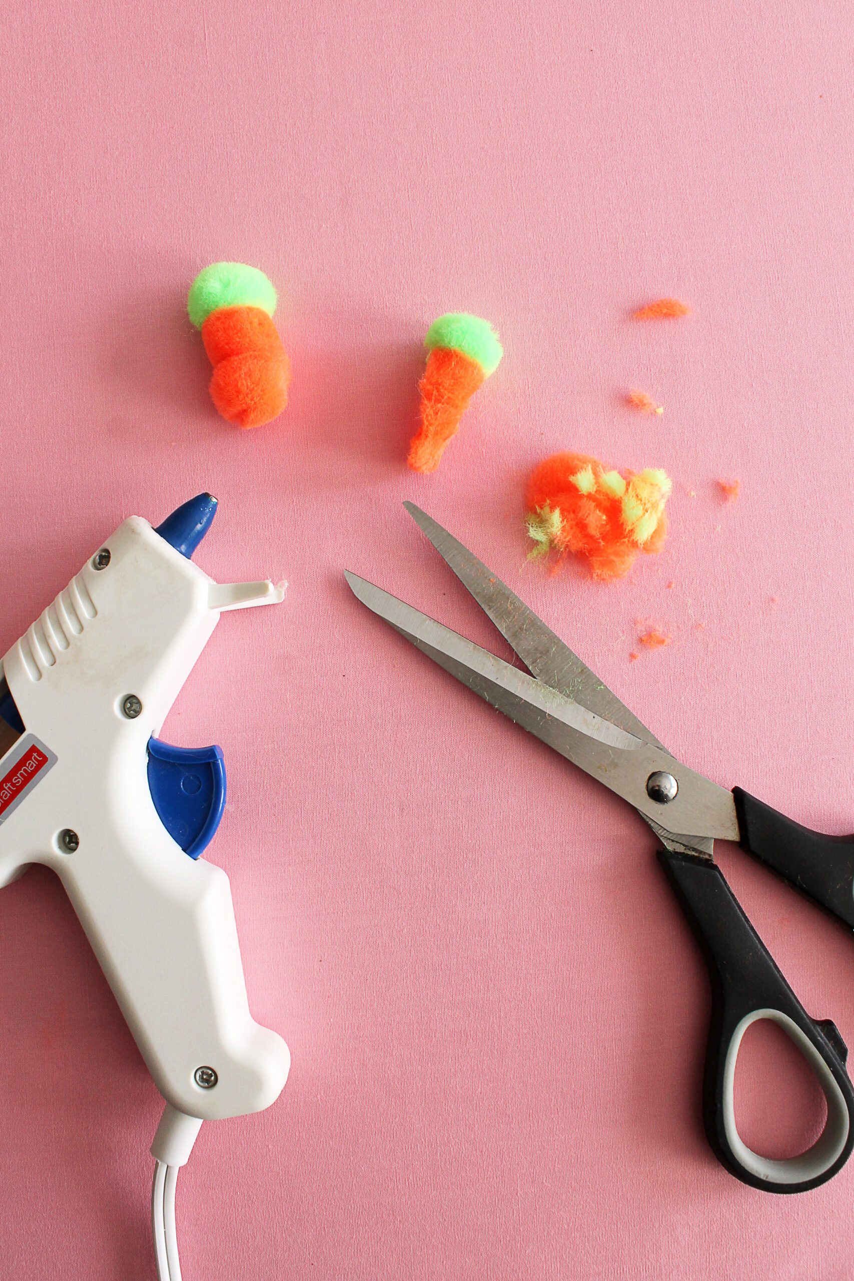 - Now use scissors to make two diagonal cuts on the stack. Make one cut across the top to make a carrot shape. Trim pompoms as needed till desired carrot shape is achieved.ย