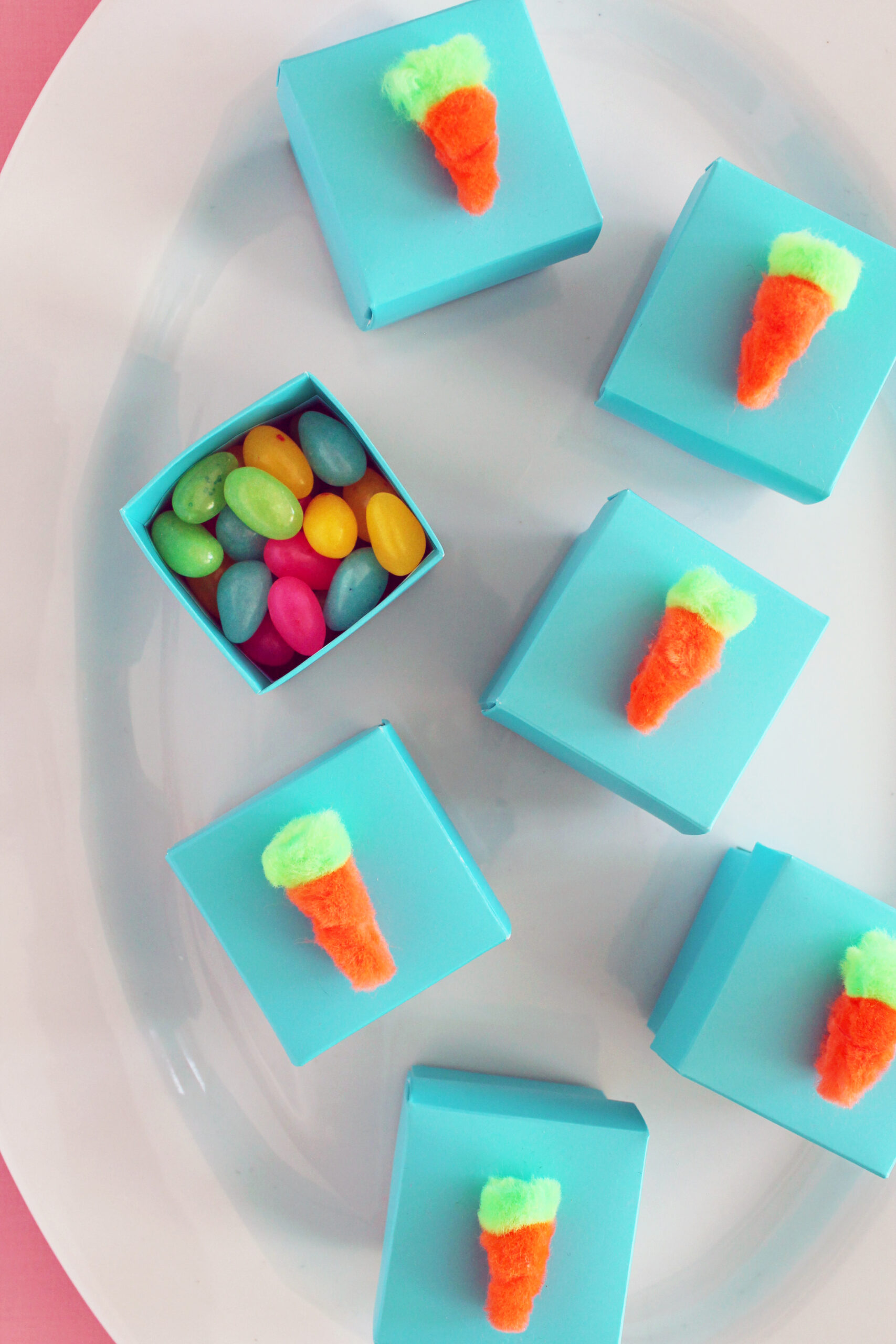 Using just pompoms, scissors and glue, these adorable carrot favor boxes come to life. I’ve used a small, 2″ x 2″ sized favor box which comes in a pack of 12. The smaller sized box made the whole craft come together faster. Plus, it’s the perfect sized box for jelly beans – a very quintessential Easter treat! But of course, you can substitute for whatever Easter favor – whether edible or not – that works for your guests!